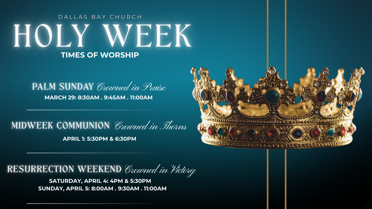Palm Sunday: Crowned in PraiseSunday, March 298:30AM . 9:45AM . 11:30AMRegular Preschool & Children’s. All services are identical. Midweek Communion: Crowned in ThornsWednesday, April 15:30PM . 6:30PMChildcare for ages 2 & under only. Both services are identical. Easter: Crowned in PraiseSaturday, April 44:00PM . 5:30PMSunday, April 58:00AM . 9:30AM . 11:00AMChildcare for ages 2 & under only. All services are identical.